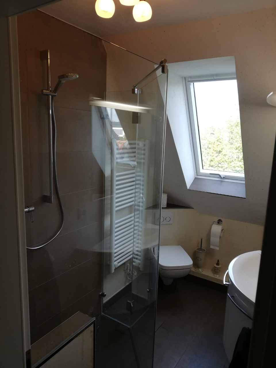 In diesem Dachschrägenbad wurden für den Boden und Duschbereich fast fugenlose, große dunkle Fliesen verlegt. Als Wandbelag wurde ein heller Natursteinputz gewählt. Diese Kombination lässt das Bad größer, moderner und aufgeräumter wirken. Des Weiteren wurden ein helles Wand-WC sowie eine Waschtischanlage mit ausreichend Stauraum verbaut. Die Badewanne wurde durch eine Duschfläche mit niedriger Einstiegshöhe und Glastüren ersetzt.