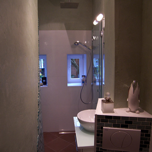 Im Eingangsbereich ist das Bad nur 90 cm breit und wird dann im hinteren Bereich deutlich breiter. Auf 3 Quadratmeter wurde ein Mini-Badezimmer mit großzügigem, ebenerdigem Duschbereich mit Ablaufrinne realisiert. Die klappbare Duschabtrennung teilt bei Bedarf den Duschbereich ab. Die Duschabtrennung schützt beim Duschen den Rest des Mini-Duschbades vor Spritzwasser. An die Wand geklappt erlaubt die Duschabtrennung eine effiziente Raumnutzung. In diesem speziellen Fall wurde die halbrunde Wand des Treppenhauses geschickt ins Design integriert. Der Spülkasten wurde mit einem Glasmosaik versehen, das auf der halbrunden Wand weitergeführt wurde.