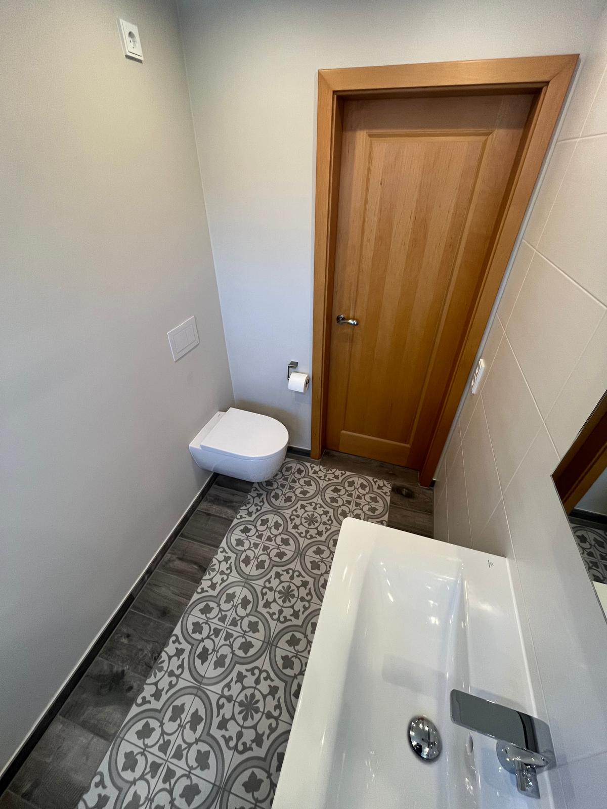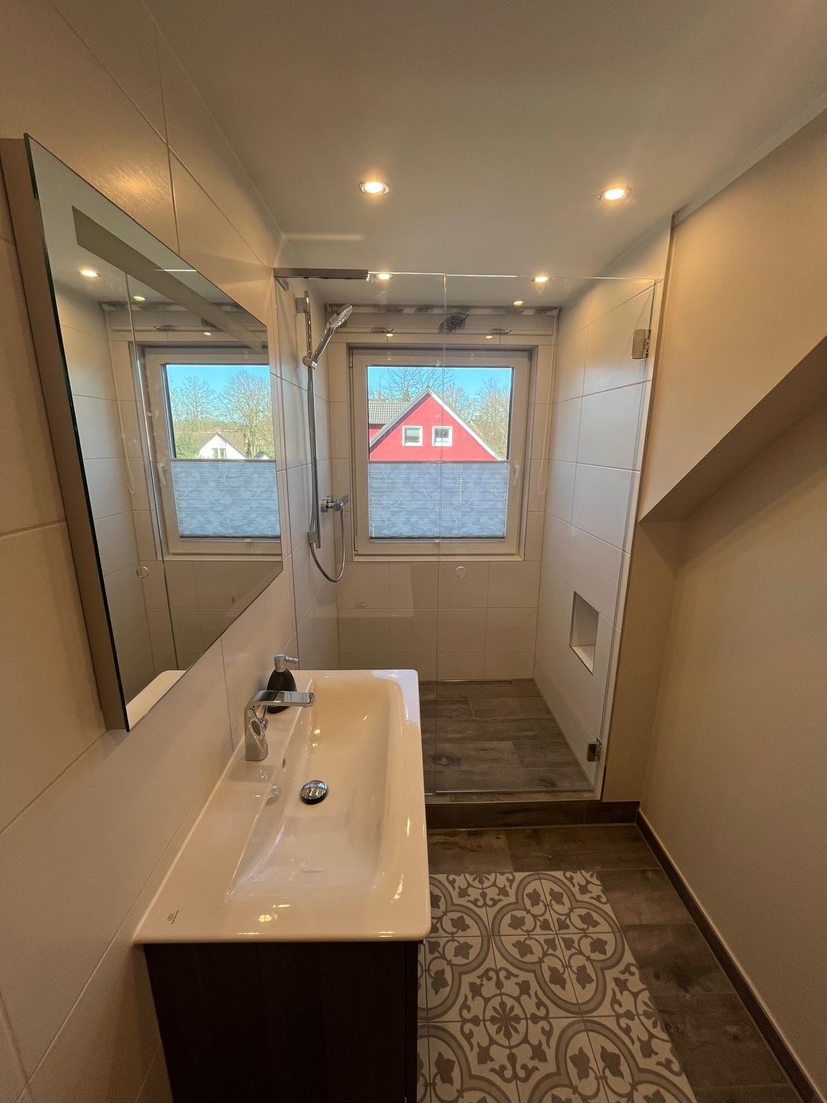Die Wandflächen in der Dusche und an der Waschtischwand sind nun raumhoch verfliest, während die übrigen Wände mit einer Vliestapete versehen und anschließend gestrichen wurden. So entsteht ein ruhiges, modernes Gesamtbild. Auf dem Boden wurde eine Fliese in Holzoptik verlegt, die dem Raum eine warme, wohnliche Anmutung verleiht. Im vorderen Bereich des Badezimmers setzen Dekorfliesen zusätzliche Akzente und gliedern den Raum optisch.