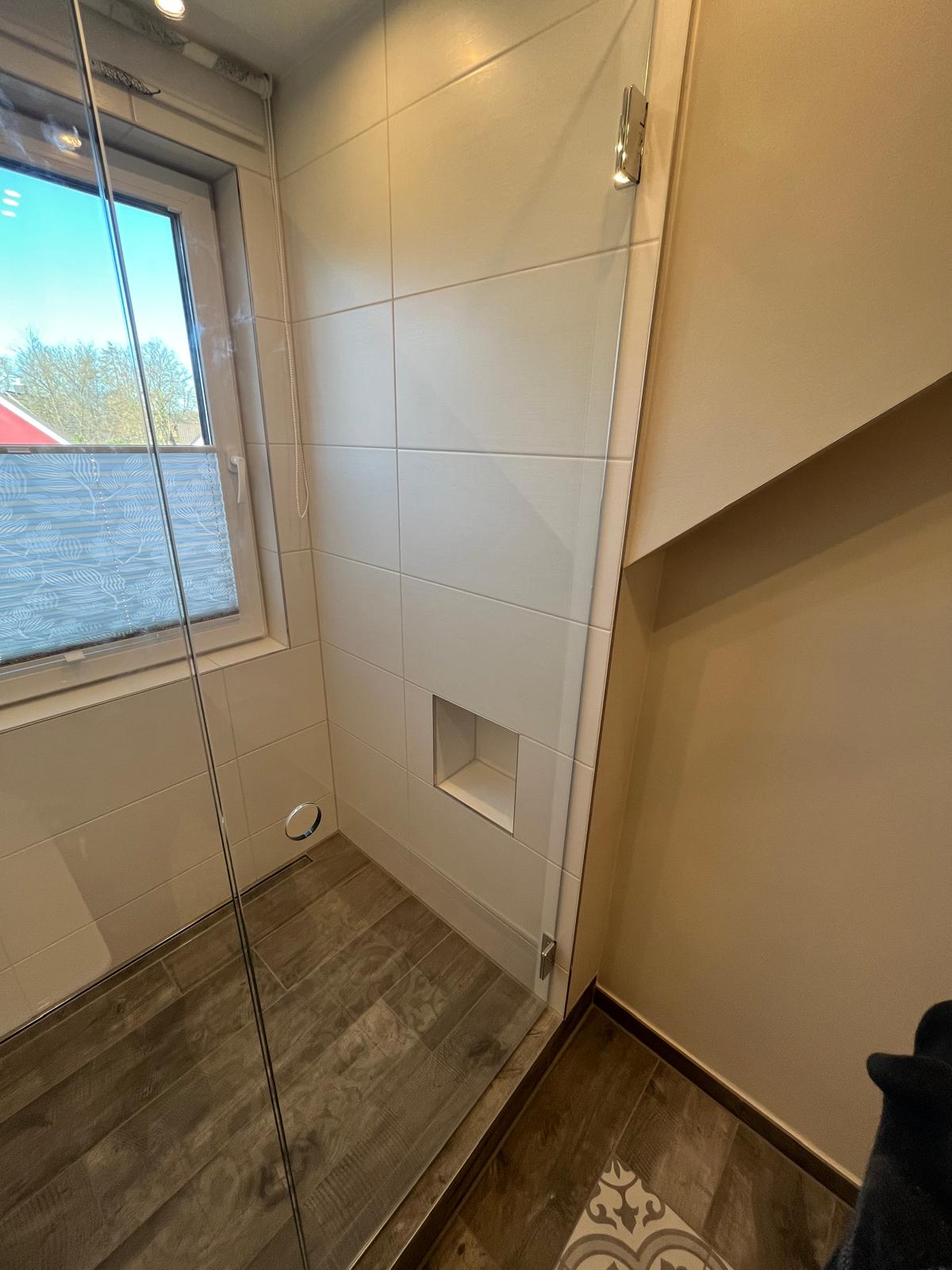 Zu Beginn wurden alle vorhandenen Sanitärobjekte sowie die bisherigen Wand und Bodenbeläge entfernt. Im Bereich der Dusche entstand eine Podestfläche mit integrierter Ablaufrinne, die für einen sicheren Wasserablauf sorgt. In die rechte Wand des Duschbereichs wurde eine geflieste Ablagenische eingearbeitet, die mit Mosaikfliesen verkleidet ist und Stauraum für Pflegeprodukte bietet.