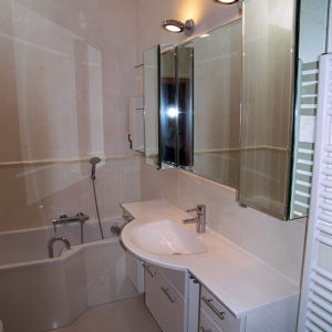 In diesem Bad wurde auf begrenztem Raum ein Vollbad umgesetzt. Die Raumspar-Wanne mit einer Einstiegshilfe in Form eines Wannengriffs ist nur eines der interessanten Details.