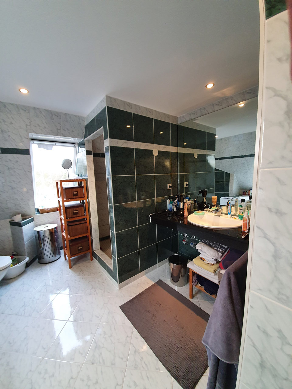 In diesem Dachgeschoss-Badezimmer mit zwei Dachschrägen wurde die alte Badewanne durch eine Acrylbadewanne mit Wannenrandarmatur ausgetauscht. Im neuen Duschbereich wurde ein Unterputz-Brausemischer mit Regenbrause und Brauseset montiert. Zudem wurde eine neue Waschtischplatte aus Corian mit Aufsatzbecken verbaut. Ein dazu passender Waschtisch-Unterschrank bietet zusätzlichen Stauraum für Handtücher, Kosmetikartikel und weitere Badutensilien.